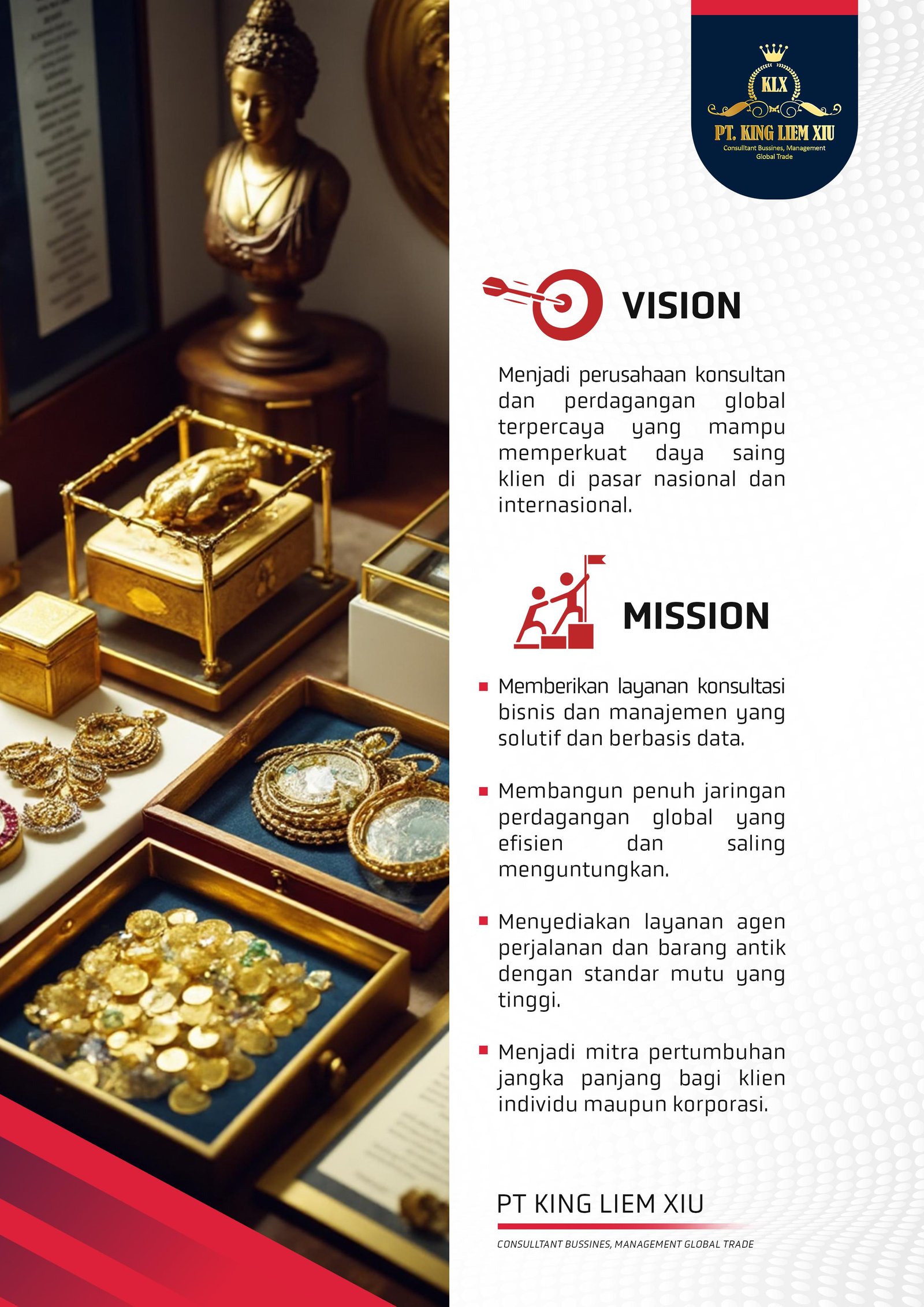 Menjadi perusahaan konsultan dan perdagangan global terpercaya yang mampu memperkuat daya saing klien di pasar nasional dan internasional.